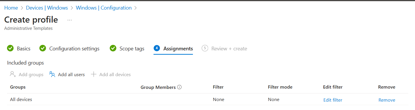 Select all devices to deploy to all Windows enrolled in Intune or add filter for limited rollout. Click Next