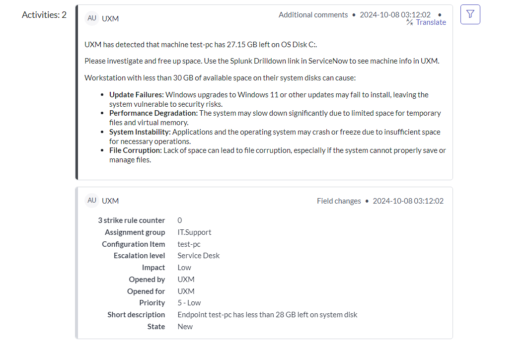 In environments without ServiceNow ITOM, UXM can still detect issues such as low disk space, degraded performance, or cache buildup, and then initiate remediation workflows through Intune or Configuration Manager—such as running PowerShell scripts, clearing temporary files, or enforcing configuration fixes.