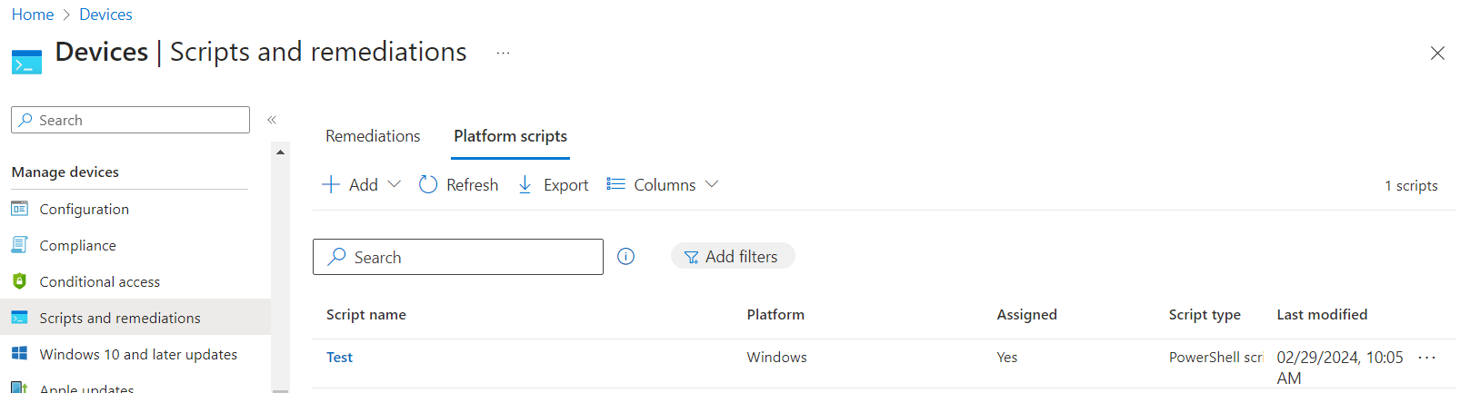 The Intune management extension agent checks with Intune once every hour and after every reboot for any new scripts or changes. After you assign the policy to the Azure AD groups, the PowerShell script runs, and the run results are reported.